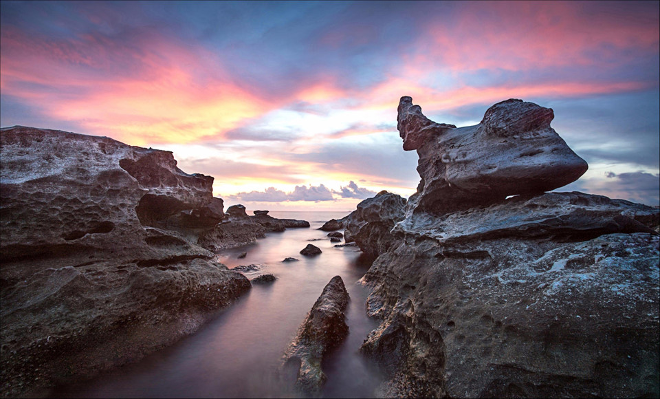Cả huyện đảo Phú Quốc bỗng trở nên huyền ảo hơn khi hoàng hôn buông xuống. Những khối đá hình thù kỳ lạ ven biển tại vịnh Eo Xoài (thuộc xã Cửa Dương) trong ánh chiều tà đẹp hoang sơ, nhẹ nhàng mà vẫn đầy thu hút.
