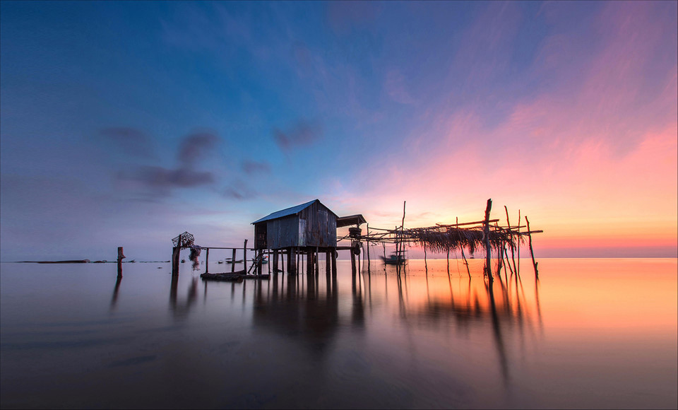 Ấp Cây Sao tại xã Hàm Ninh. Cư dân nơi đây mưu sinh cùng biển với nghề nuôi ốc. Căn chòi giữ ốc ở biển khi bình minh lên rực rỡ sắc màu, soi bóng dưới mặt nước.